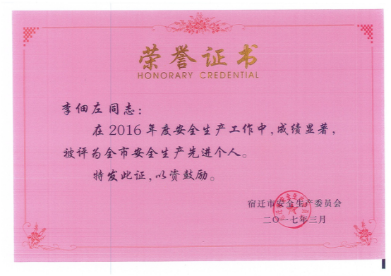 2017年3月,物業(yè)部李佃左同志獲得宿遷市安全生產(chǎn)委員會授予的“全市安全生產(chǎn)先進(jìn)個人”榮譽(yù)證書。