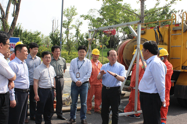 在同里湖路,李榮錦認(rèn)真聽取了園區(qū)城市排水防澇工作進(jìn)展情況匯報(bào),現(xiàn)場(chǎng)查看了管道疏通清淤工作,并詳細(xì)詢問(wèn)了管道CCTV檢測(cè)流程等情況。